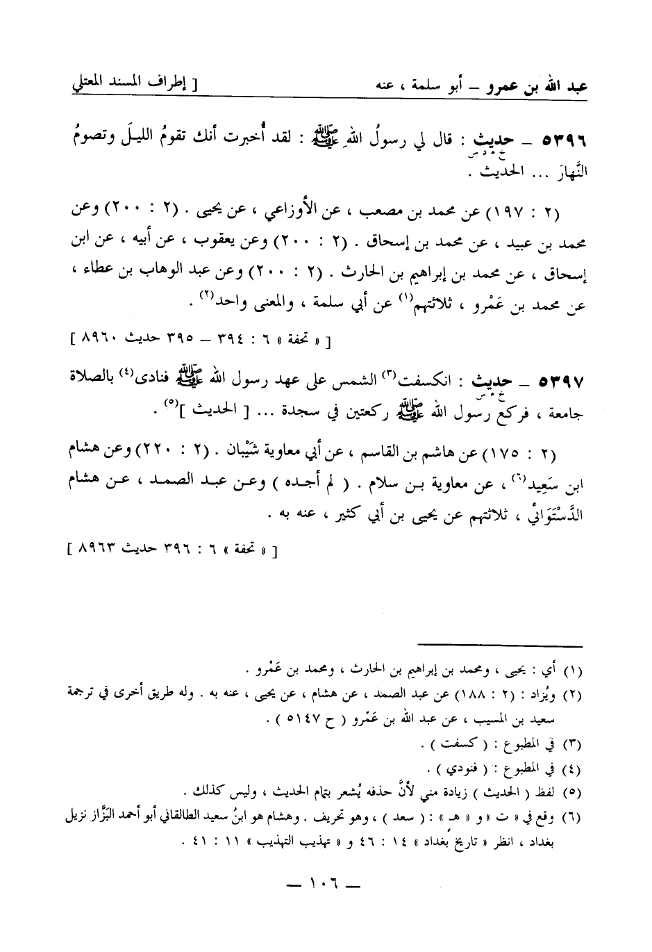 5396 -[خ م د س] حديث قال لي رسول الله صَلَّى اللَّهُ عَلَيْهِ وَسَلَّمَ لقد أخبرت أنك تقوم الليل وتصوم النهار ... الحديث. (2: 197) عن محمد بن مصعب، عن الأوزاعي، عن يحيى (2: 200) وعن محمد بن عبيد، عن محمد بن إسحاق (2: 200) وعن يعقوب، عن أبيه، عن ابن إسحاق، عن محمد بن إبراهيم بن الحارث (2: 200) وعن عبد الوهاب بن عطاء، عن محمد بن عمرو ثلاثتهم، عن أبي سلمة والمعنى واحد