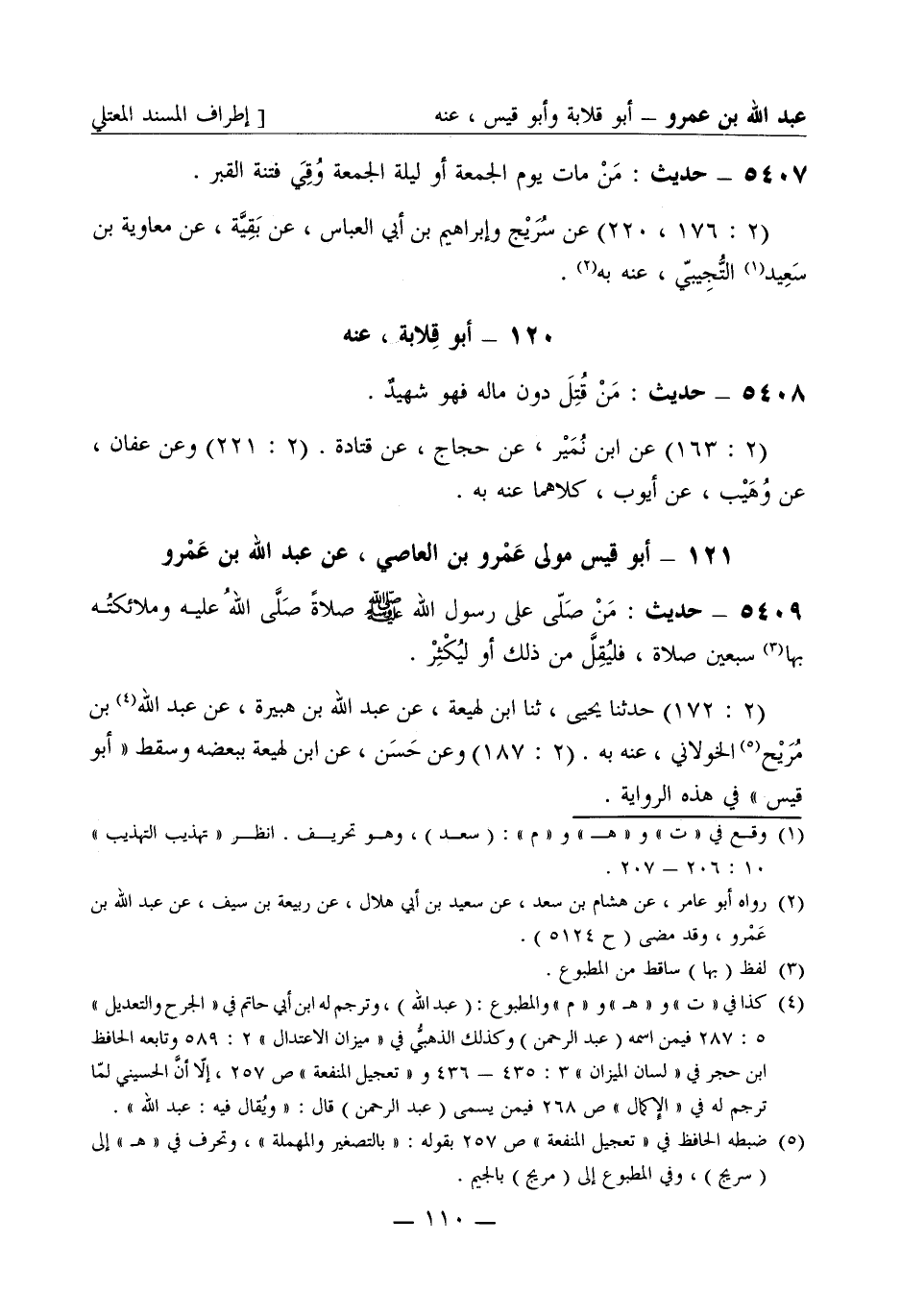 5409 - حديث من صلى على رسول الله صَلَّى اللَّهُ عَلَيْهِ وَسَلَّمَ صلاة صلى الله عليه وملائكته بها سبعين صلاة فليقل من ذلك أو ليكثر (2: 172) حدثنا يحيى، ثنا ابن لهيعة، عن عبد الله بن هبيرة، عن عبد الله بن مريح الخولاني عنه به. (2: 187) وعن حسن، عن ابن لهيعة ببعضه وسقط أبو قيس في هذه الرواية