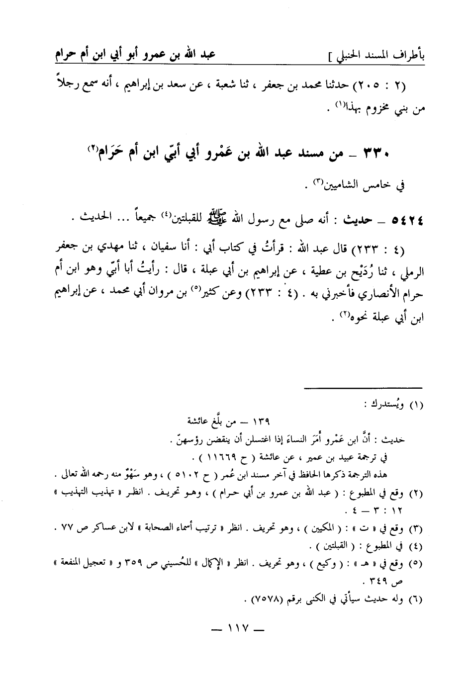 5424 - حديث أنه صلى مع رسول الله صَلَّى اللَّهُ عَلَيْهِ وَسَلَّمَ للقبلتين جميعا ... الحديث (4: 233) قال عبد الله قرأت في كتاب أبي أنا سفيان، ثنا مهدي بن جعفر الرملي، ثنا رديح بن عطية، عن إبراهيم بن أبي عبلة قال رأيت أبا أبي وهو ابن أم حرام الأنصاري فأخبرني به (4: 233) وعن كثير بن مروان أبي محمد، عن إبراهيم بن أبي عبلة نحوه.