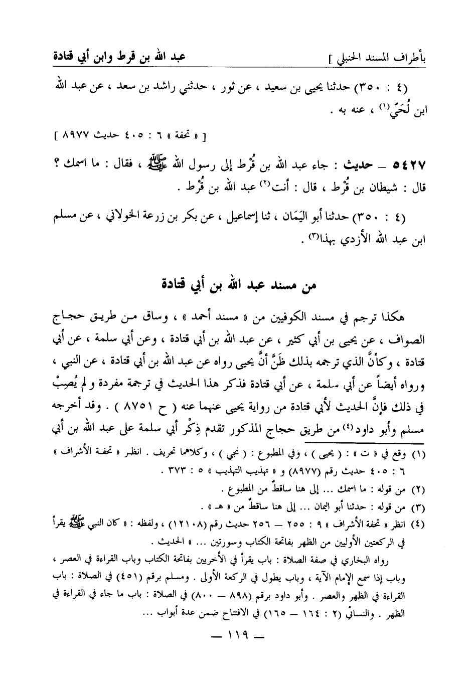 من مسند عبد الله بن أبي قتادة هكذا ترجم في مسند الكوفيين من مسند أحمد وساق من طريق حجاج الصواف، عن يحيى بن أبي كثير، عن عبد الله بن أبي قتادة وعن أبي سلمة، عن أبي قتادة وكأن الذي ترجمه بذلك ظن أن يحيى رواه، عن عبد الله بن أبي قتادة، عن النبي ورواه أيضا، عن أبي سلمة، عن أبي قتادة فذكر هذا الحديث في ترجمة مفردة ولم يصب في ذلك فإن الحديث لأبي قتادة من رواية يحيى عنهما عنه (ح 8751) وقد أخرجه مسلم وأبو داود من طريق حجاج المذكور تقدم ذكر أبي سلمة على عبد الله بن أبي -[120]- قتادة وأخرجه الشيخان وغيرهما من عدة طرق، عن يحيى، عن عبد الله بن أبي قتادة، عن أبيه
