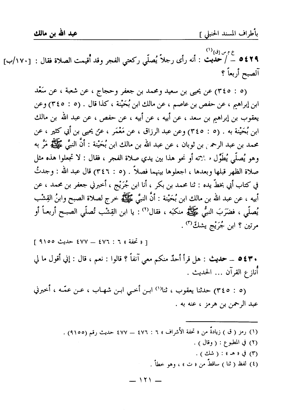 5429 -[خ م س] [ق] حديث أنه رأى رجلا يصلي ركعتي الفجر وقد أقيمت الصلاة فقال آلصبح أربعا؟ (5: 345) عن يحيى بن سعيد ومحمد بن جعفر وحجاج، عن شعبة، عن سعد بن إبراهيم، عن حفص بن عاصم، عن مالك ابن بحينة كذا قال (5: 345) وعن يعقوب بن إبراهيم بن سعد، عن أبيه، عن أبيه، عن حفص، عن عبد الله بن مالك ابن بحينة به (5: 345) وعن عبد الرزاق، عن معمر، عن يحيى بن أبي كثير، عن محمد بن عبد الرحمن بن ثوبان، عن عبد الله بن مالك ابن بحينة أن النبي صَلَّى اللَّهُ عَلَيْهِ وَسَلَّمَ مر به وهو يصلي يطول صلاته أو نحو هذا بين يدي صلاة الفجر فقال لا تجعلوا هذه مثل صلاة الظهر قبلها وبعدها اجعلوها بينهما فصلا (5: 346) قال عبد الله وجدت في كتاب أبي بخط يده، ثنا محمد بن بكر أنا ابن جريج، أخبرني جعفر بن محمد، عن أبيه، عن عبد الله بن مالك ابن بحينة: أن النبي صَلَّى اللَّهُ عَلَيْهِ وَسَلَّمَ خرج لصلاة الصبح وابن القشب يصلي فضرب النبي صَلَّى اللَّهُ عَلَيْهِ وَسَلَّمَ منكبه فقال يا ابن القشب تصلي الصبح أربعا أو مرتين؟ ابن جريج يشك