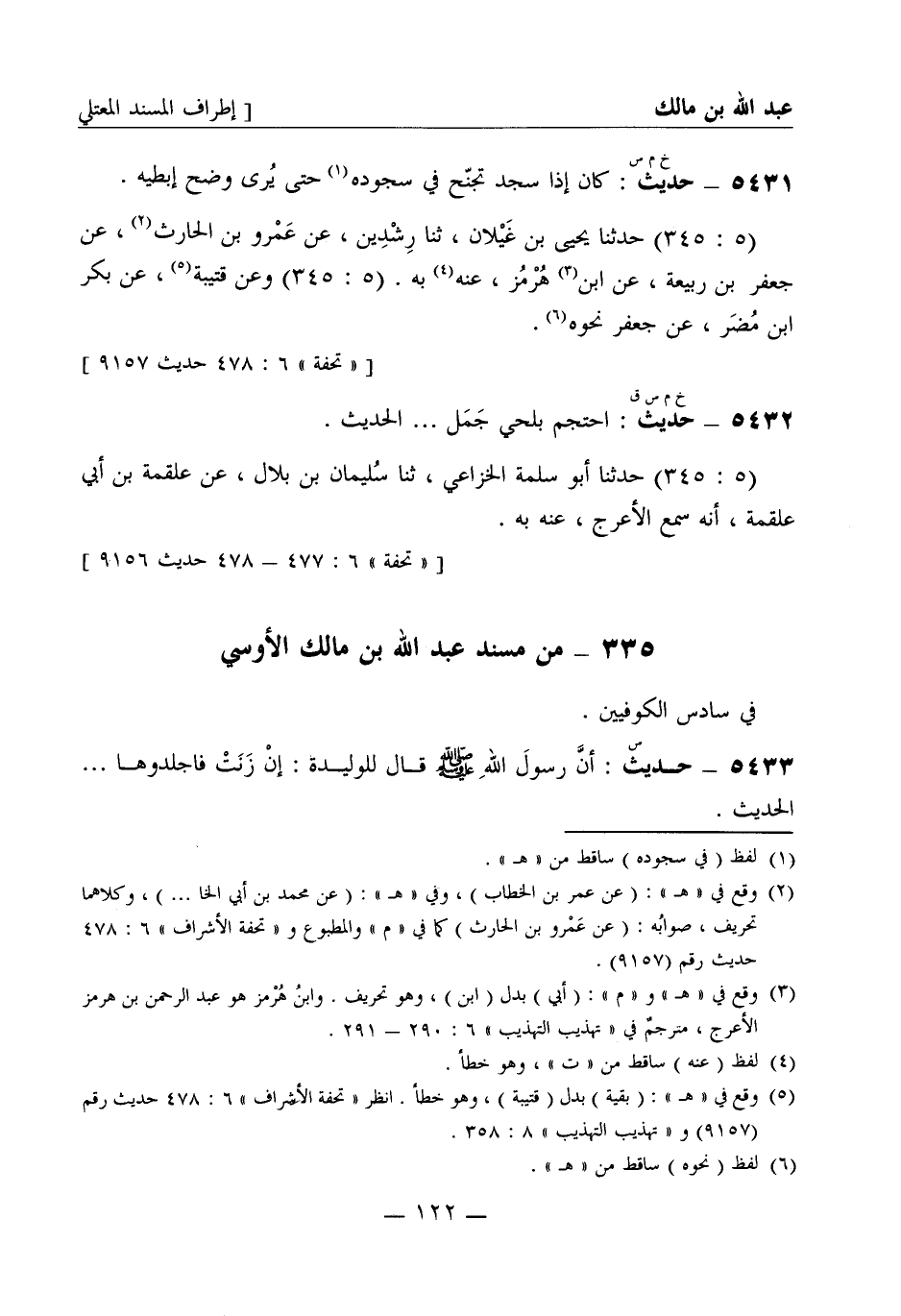 5431 -[خ م س] حديث كان إذا سجد تجنح في سجوده حتى يرى وضح إبطيه (5: 345) حدثنا يحيى بن غيلان، ثنا رشدين، عن عمرو بن الحارث، عن جعفر بن ربيعة، عن ابن هرمز عنه به. (5: 345) وعن قتيبة، عن بكر بن مضر، عن جعفر نحوه.