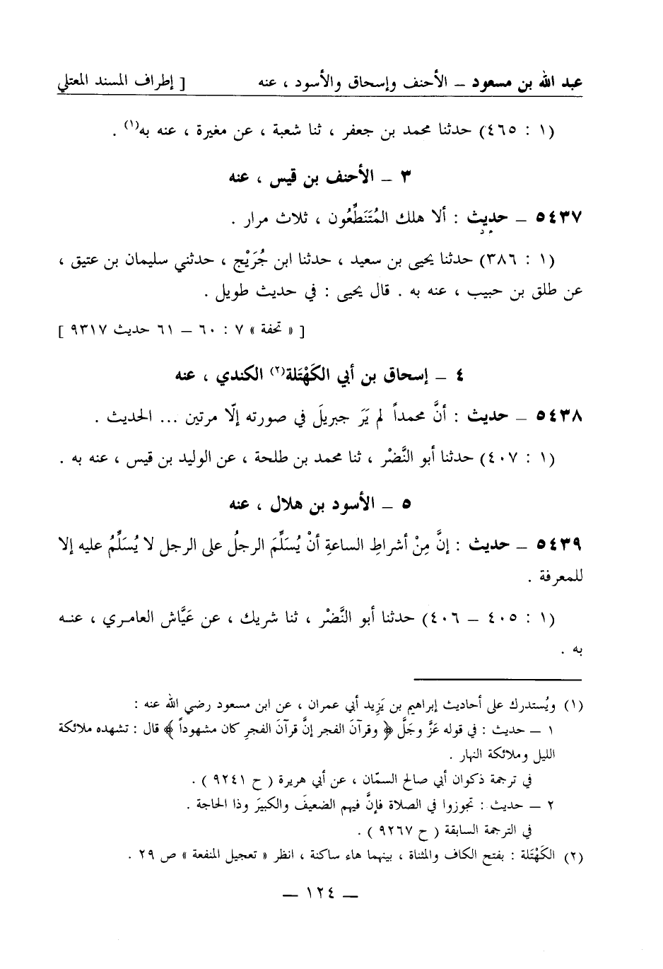 5438 - حديث أن محمد لم ير جبريل في صورته إلا مرتين ... الحديث. (1: 407) حدثنا أبو النضر، ثنا محمد بن طلحة، عن الوليد بن قيس عنه به.