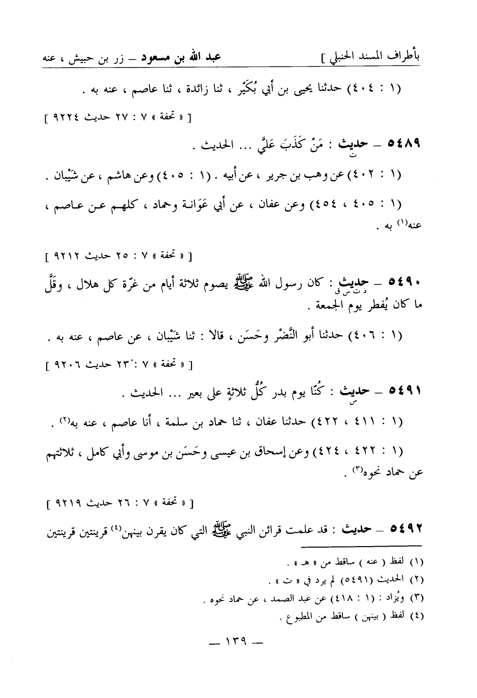 5492 - حديث قد علمت قرائن النبي صَلَّى اللَّهُ عَلَيْهِ وَسَلَّمَ التي كان يقرن بينهن قرينتين قرينتين -[140]- من أول المفصل ... الحديث. وفيه قصة الرجل الذي سأله عن مسألة ماء آسن (1: 412) حدثنا عفان، ثنا حماد، ثنا عاصم عنه به.