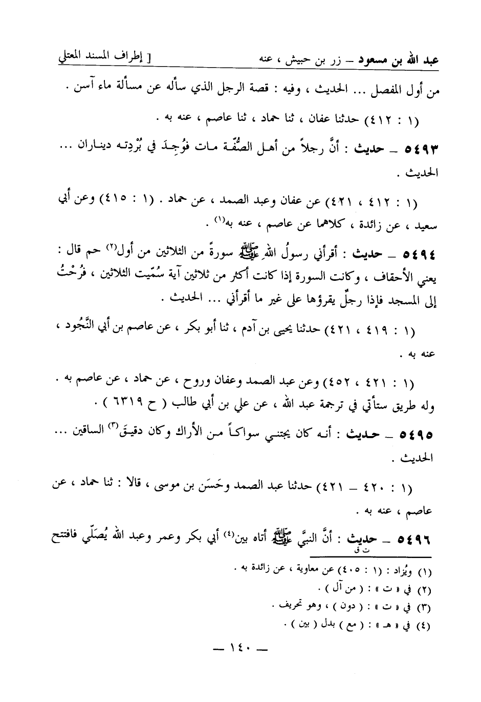 5494 - حديث أقرأني رسول الله صَلَّى اللَّهُ عَلَيْهِ وَسَلَّمَ سورة من الثلاثين من أول حم قال يعني الأحقاف وكانت السورة إذا كانت أكثر من ثلاثين آية سميت الثلاثين فرحت إلى المسجد فإذا رجل يقرؤها على غير ما أقرأني ... الحديث. (1: 419، 421) حدثنا يحيى بن آدم، ثنا أبو بكر عن عاصم بن أبي النجود عنه به. (1: 421، 452) وعن عبد الصمد وعفان وروح، عن حماد، عن عاصم به وله طريق ستأتي في ترجمة عبد الله، عن علي بن أبي طالب (ح 6319)