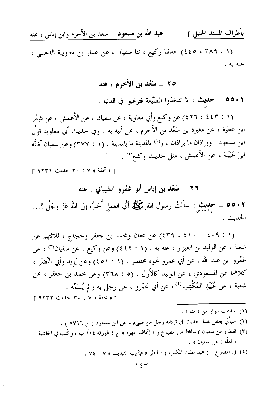 5501 -[ت] حديث لا تتخذوا الضيعة فترغبوا في الدنيا (1: 443، 426) عن وكيع وأبي معاوية، عن سفيان، عن الأعمش، عن شمر بن عطية، عن مغيرة بن سعد بن الأخرم، عن أبيه به. وفي حديث أبي معاوية قول ابن مسعود وبراذان ما براذان وبالمدينة ما بالمدينة (1: 377) وعن سفيان أظنه ابن عيينة، عن الأعمش مثل حديث وكيع