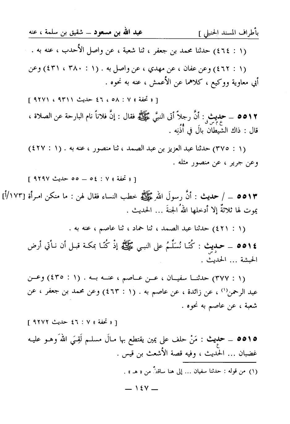5512 -[خ م س ق] حديث أن رجلا أتى النبي صَلَّى اللَّهُ عَلَيْهِ وَسَلَّمَ فقال: إن فلانا نام البارحة عن الصلاة قال ذاك الشيطان بال في أذنه (1: 375) حدثنا عبد العزيز بن عبد الصمد، ثنا منصور عنه به. (1: 427) وعن جرير، عن منصور مثله