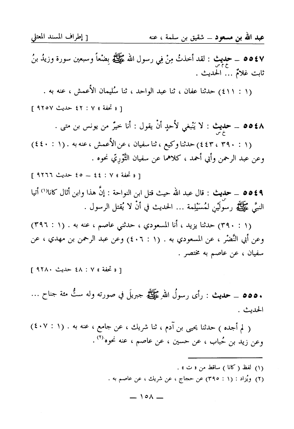 5549 -[س] حديث قال عبد الله حيث قتل ابن النواحة إن هذا وابن أثال كانا أتيا النبي صَلَّى اللَّهُ عَلَيْهِ وَسَلَّمَ رسولين لمسيلمة ... . الحديث في أن لا يقتل الرسول (1: 390) حدثنا يزيد أنا المسعودي، حدثني عاصم، عنه به. (1: 396) وعن أبي النضر، عن المسعودي به (1: 406) وعن عبد الرحمن بن مهدي، عن سفيان، عن عاصم به مختصر