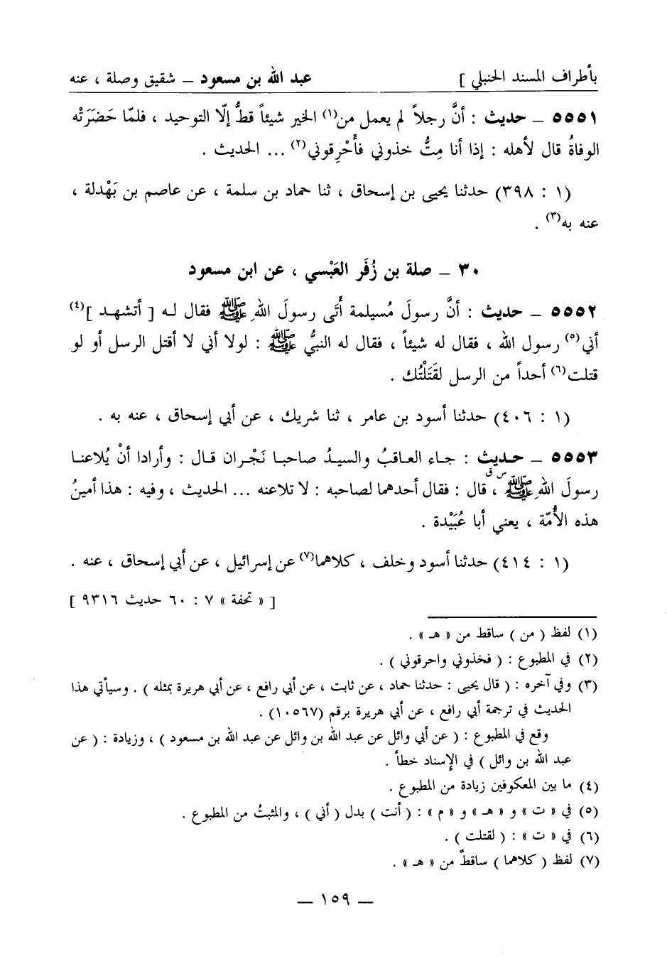 5552 - حديث أن رسول مسيلمة أتى رسول الله صَلَّى اللَّهُ عَلَيْهِ وَسَلَّمَ فقال له [أتشهد] أني رسول الله فقال له شيئا فقال له النبي صَلَّى اللَّهُ عَلَيْهِ وَسَلَّمَ لولا أني أقتل الرسل أو لو قتلت أحدا من الرسل لقتلتك (1: 406) حدثنا أسود بن عامر، ثنا شريك، عن أبي إسحاق عنه به.