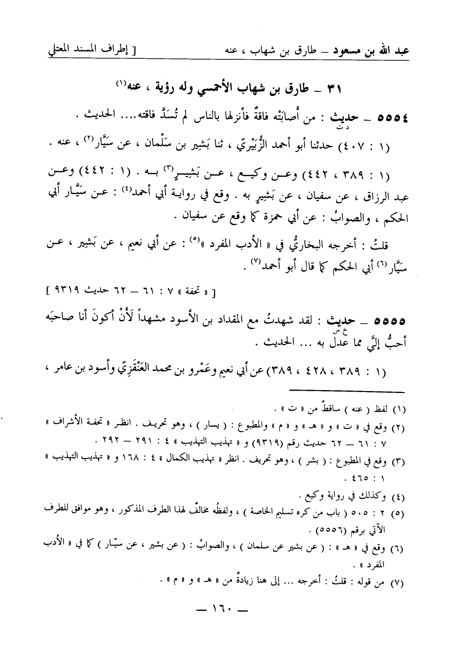 5555 -[خ س] حديث لقد شهدت مع المقداد بن الأسود مشهدا لأن أكون أنا صاحبه أحب إلي مما عدل به ... الحديث. (1: 389، 428، 389) عن أبي نعيم وعمرو بن محمد العنقزي وأسود بن عامر -[161]- ثلاثتهم، عن إسرائيل، عن مخارق عنه به. (1: 457 - 458) وعن عبيدة بن حميد، عن المخارق به نحوه.