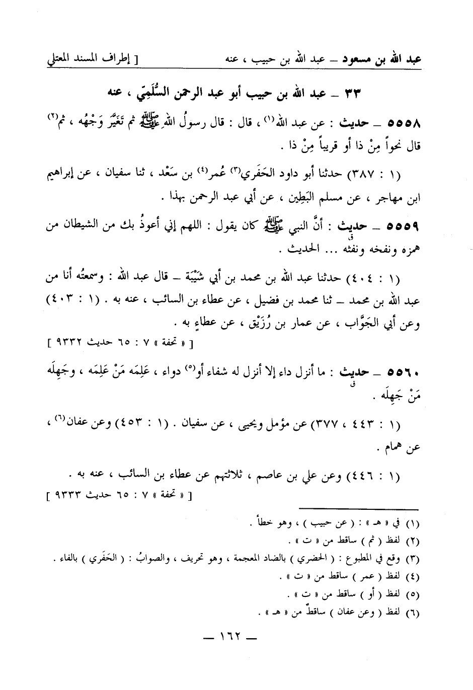 5558 - حديث، عن عبد الله قال قال رسول الله صَلَّى اللَّهُ عَلَيْهِ وَسَلَّمَ ثم تغير وجهه ثم قال نحوا من ذا أو قريبا من ذا (1: 387) حدثنا أبو داود الحفري عمر بن سعد، ثنا سفيان، عن إبراهيم بن مهاجر، عن مسلم البطين، عن أبي عبد الرحمن بهذا