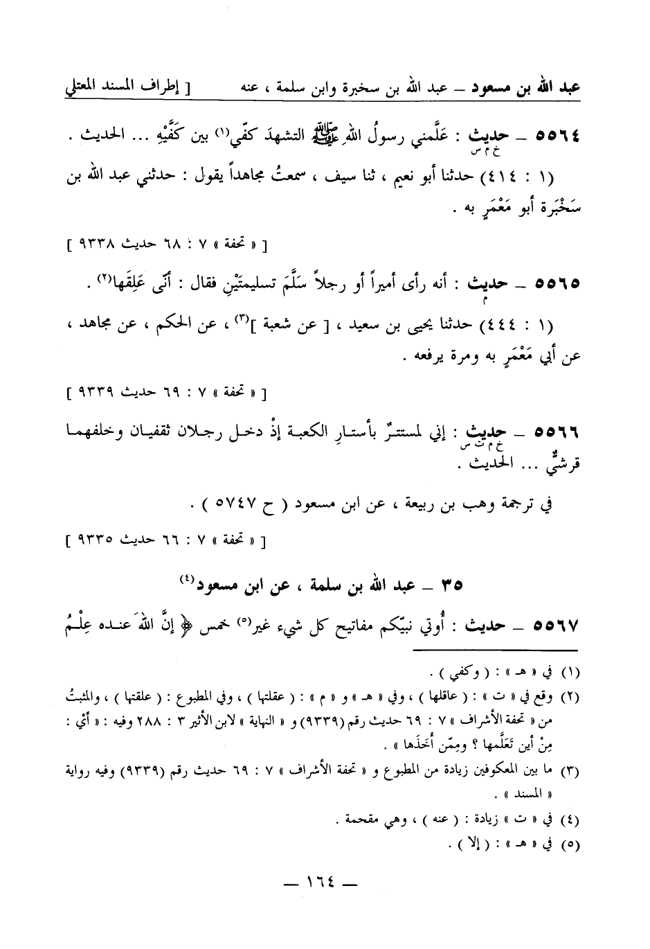 5567 - حديث أوتي نبيكم مفاتيح كل شيء غير خمس إن الله عنده علم -[165]- الساعة وينزل الغيث الآية (1: 386، 438) عن يحيى ومحمد بن جعفر، عن شعبة (1: 445) وعن وكيع، عن مسعر، كلاهما عن عمرو بن مرة عنه به.