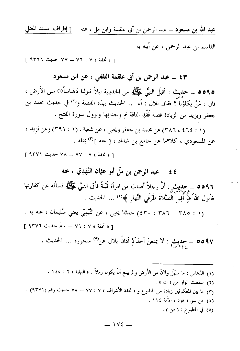 5596 -[خ م ت س ق] حديث أن رجلا أصاب من امرأة قبلة فأتى النبي صَلَّى اللَّهُ عَلَيْهِ وَسَلَّمَ فسأله عن كفارتها فأنزل الله أقم الصلاة طرفي النهار ... الحديث. (1: 385 - 386، 430) حدثنا يحيى، عن التيمي يعني سليمان عنه به.