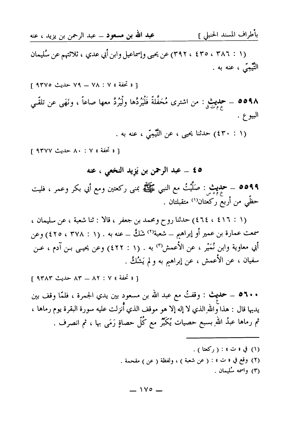5599 -[خ م د س] حديث صليت مع النبي صَلَّى اللَّهُ عَلَيْهِ وَسَلَّمَ بمنى ركعتين ومع أبي بكر وعمر فليت حظي من أربع ركعتان متقبلتان (1: 416، 464) حدثنا روح ومحمد بن جعفر قالا: ثنا شعبة، عن سليمان سمعت عمارة بن عمير أو إبراهيم - شعبة شك - عنه به. (1: 378، 425) وعن أبي معاوية وابن نمير، عن الأعمش به (1: 422) وعن يحيى بن آدم، عن سفيان، عن الأعمش، عن إبراهيم به ولم يشك