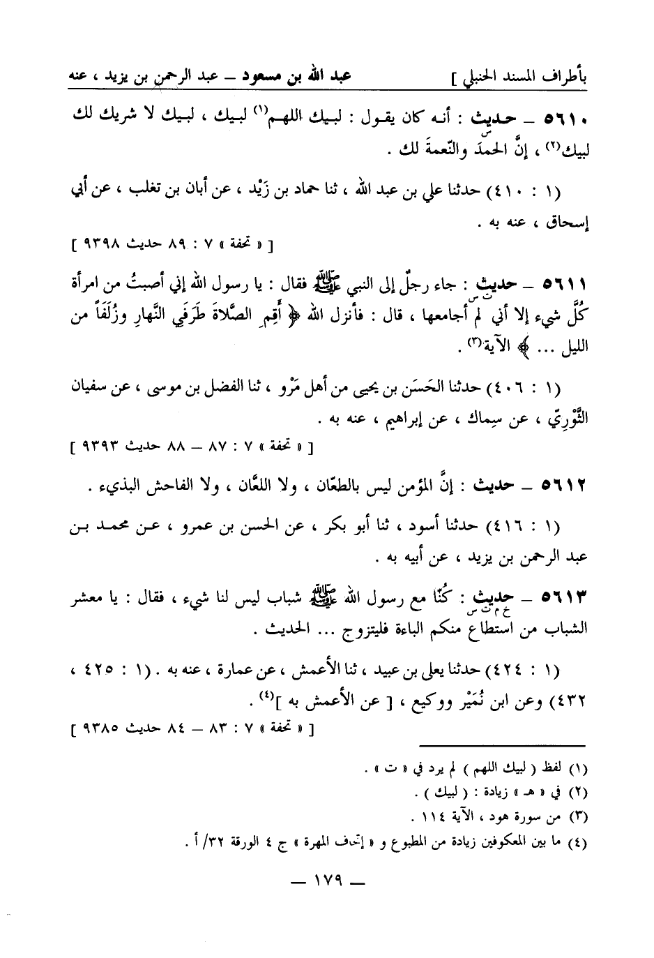 5610 -[س] حديث أنه كان يقول لبيك اللهم لبيك لبيك لا شريك لك لبيك إن الحمد والنعمة لك (1: 410) حدثنا علي بن عبد الله، ثنا حماد بن زيد، عن أبان بن تغلب، عن أبي إسحاق عنه به.