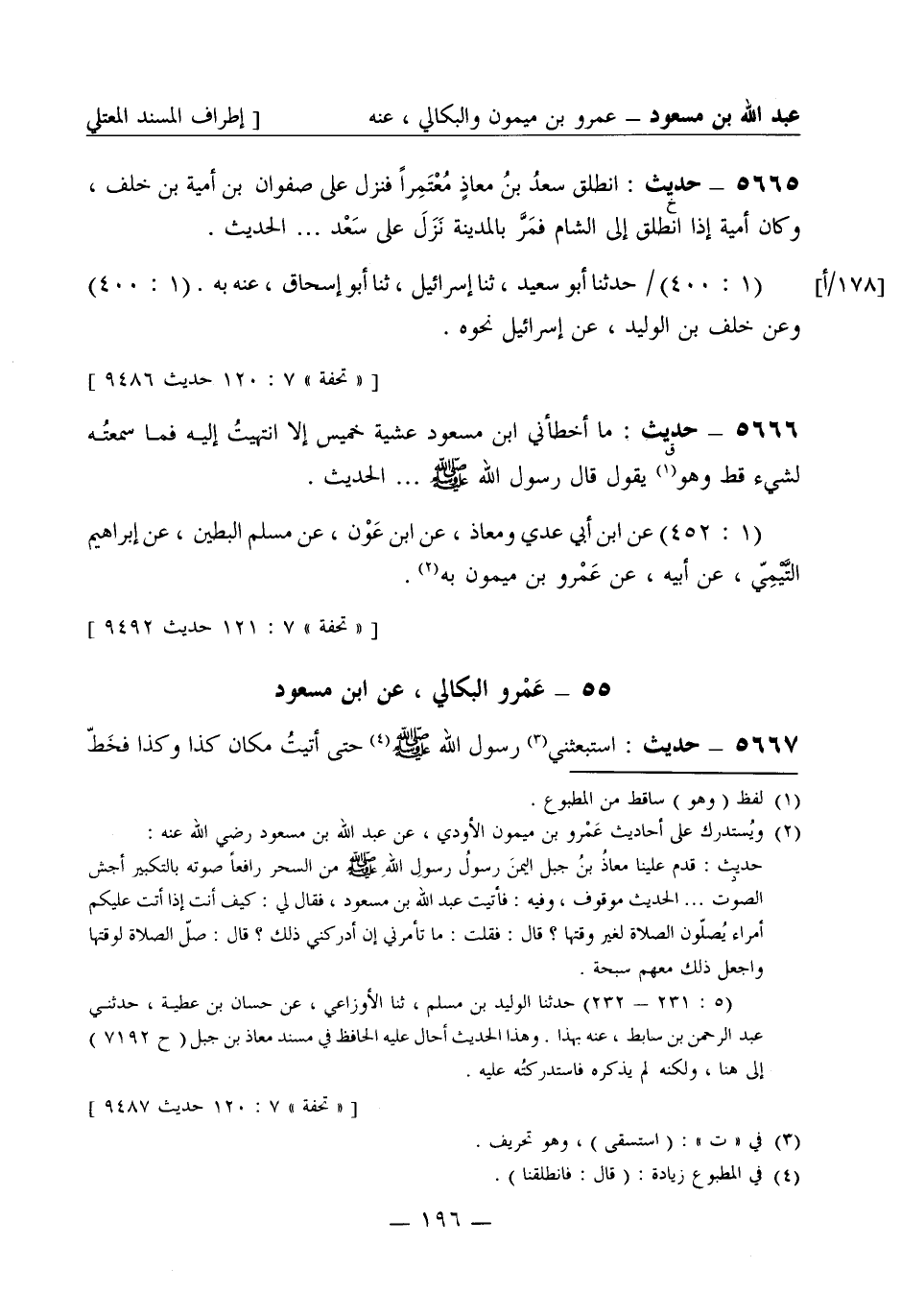 5666 -[ق] حديث ما أخطأني ابن مسعود عشية خميس إلا انتهيت إليه فما سمعته لشيء قط وهو يقول قال رسول الله صَلَّى اللَّهُ عَلَيْهِ وَسَلَّمَ ... الحديث. (1: 452) عن ابن أبي عدي ومعاذ، عن ابن عون، عن مسلم البطين، عن إبراهيم التيمي، عن أبيه، عن عمرو بن ميمون به
