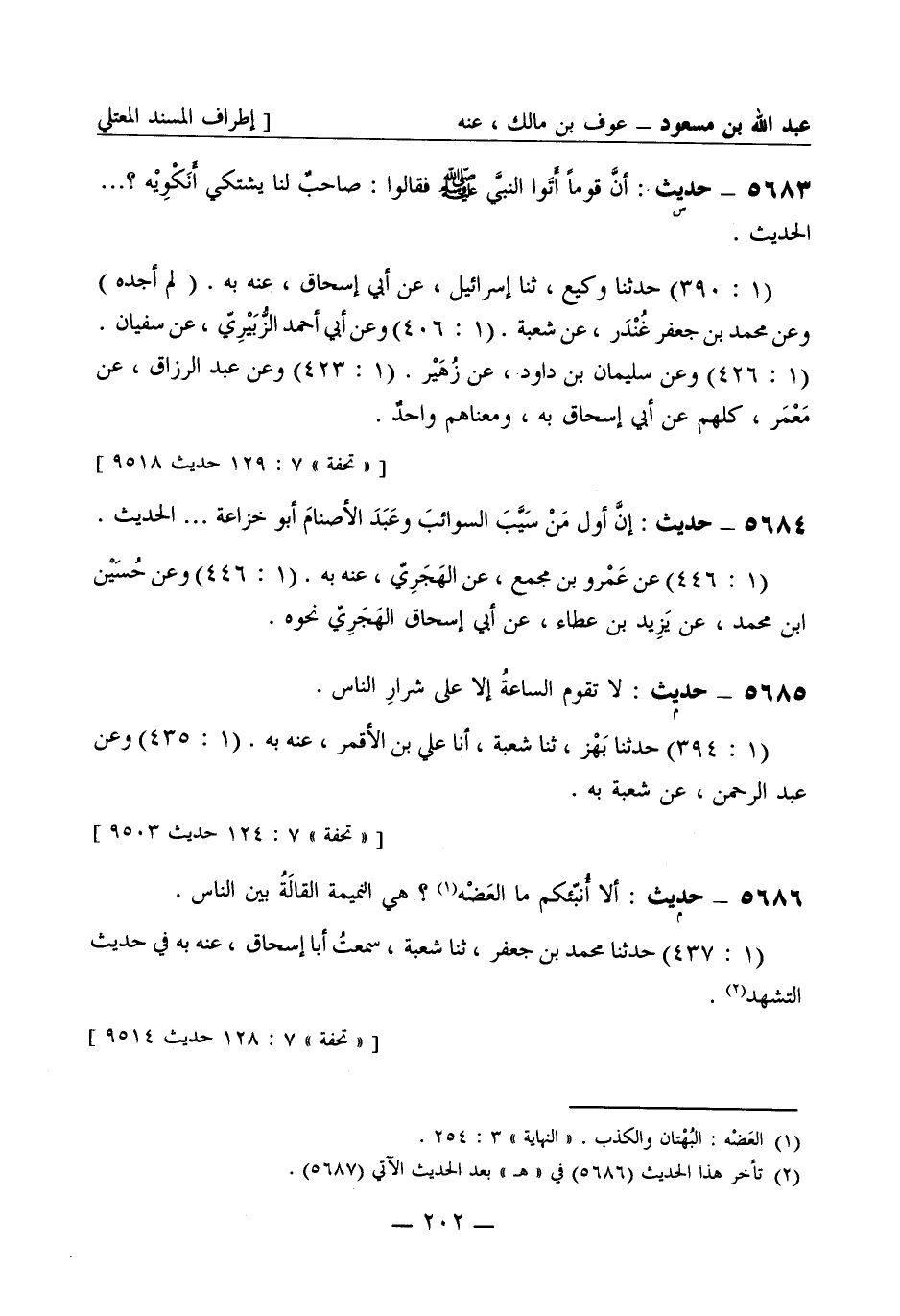 5686 -[م] حديث ألا أنبئكم ما العضه هي النميمة القالة بين الناس (1: 437) حدثنا محمد بن جعفر، ثنا شعبة سمعت أبا إسحاق عنه به. في حديث التشهد