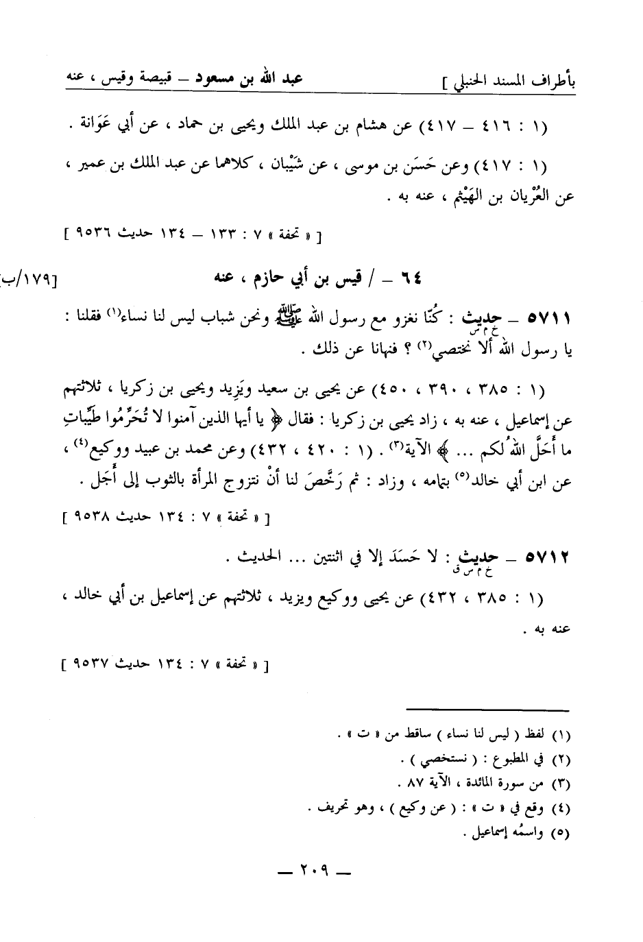 5711 -[خ م س] حديث كنا نغزو مع رسول الله صَلَّى اللَّهُ عَلَيْهِ وَسَلَّمَ ونحن شباب ليس لنا نساء فقلنا يا رسول الله ألا نختصي؟ فنهانا عن ذلك (1: 385، 390، 450) عن يحيى بن سعيد ويزيد ويحيى بن زكريا، ثلاثتهم عن إسماعيل، عنه به، زاد يحيى بن زكريا فقال يا أيها الذين آمنوا لا تحرموا طيبات ما أحل الله لكم ... الآية (1: 420، 432) وعن محمد بن عبيد ووكيع، عن ابن أبي خالد بتمامه وزاد ثم رخص لنا أن نتزوج المرأة بالثوب إلى أجل