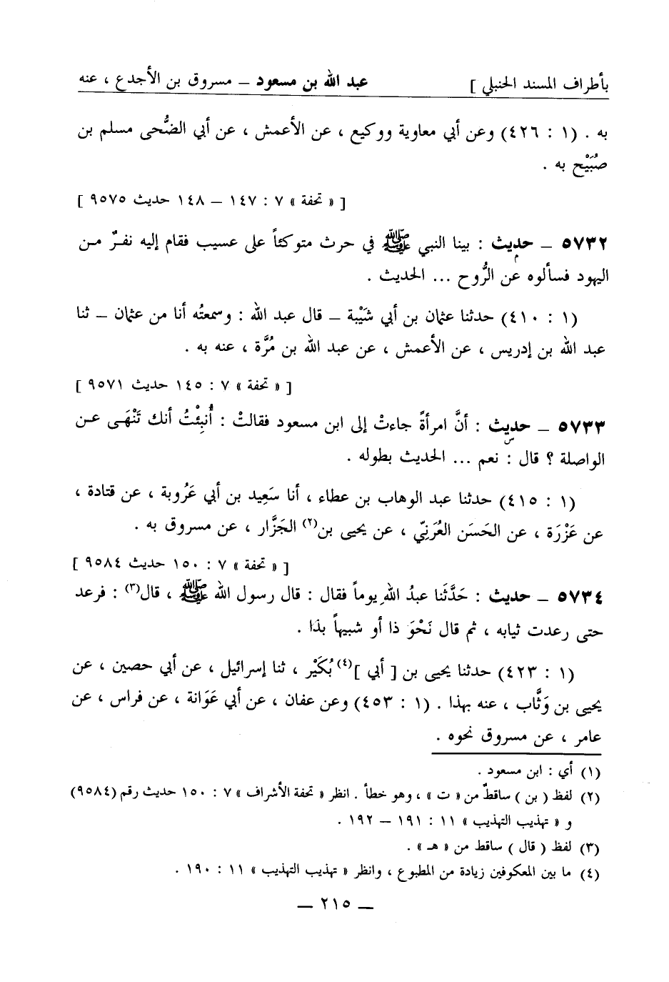 5732 -[م] حديث بينا النبي صَلَّى اللَّهُ عَلَيْهِ وَسَلَّمَ في حرث متوكئا على عسيب فقام إليه نفر من اليهود فسألوه عن الروح ... الحديث. (1: 410) حدثنا عثمان بن أبي شيبة قال عبد الله وسمعته أنا من عثمان، ثنا عبد الله بن إدريس، عن الأعمش، عن عبد الله بن مرة عنه به.