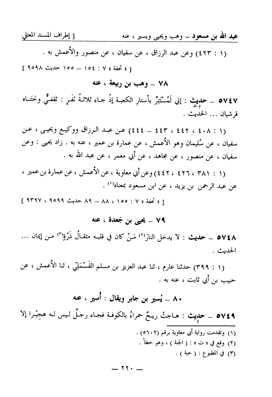 5747 - (م ت) إني لمستتر بأستار الكعبة إذا جاء ثلاثة نفر ثقفي وختناه قرشيان ... الحديث. (1: 408، 442، 443 - 444) عن عبد الرزاق ووكيع ويحيى، عن سفيان، عن سليمان وهو الأعمش، عن عمارة بن عمير عنه به. زاد يحيى وعن سفيان، عن منصور، عن مجاهد، عن أبي معمر، عن عبد الله به (1: 381، 426، 442) وعن أبي معاوية، عن الأعمش، عن عمارة بن عمير، عن عبد الرحمن بن يزيد، عن ابن مسعود بمعناه
