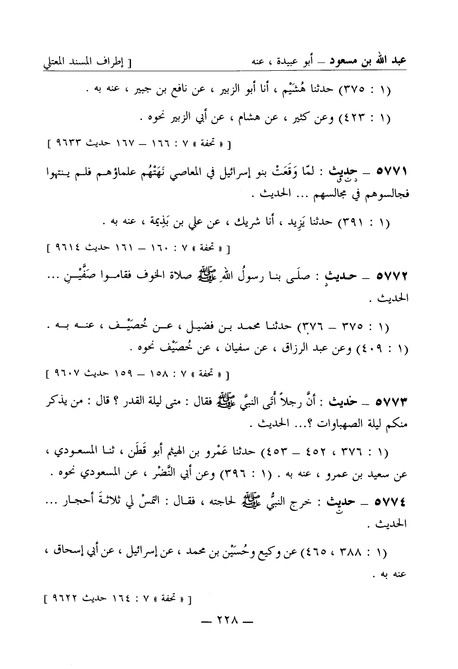 5773 - حديث أن رجلا أتى النبي صَلَّى اللَّهُ عَلَيْهِ وَسَلَّمَ فقال متى ليلة القدر؟ قال من يذكر منكم ليلة الصهباوات؟ ... . الحديث. (1: 376، 452 - 453) حدثنا عمرو بن الهيثم أبو قطن، ثنا المسعودي، عن سعيد بن عمرو عنه به. (1: 396) وعن أبي النضر، عن المسعودي نحوه.