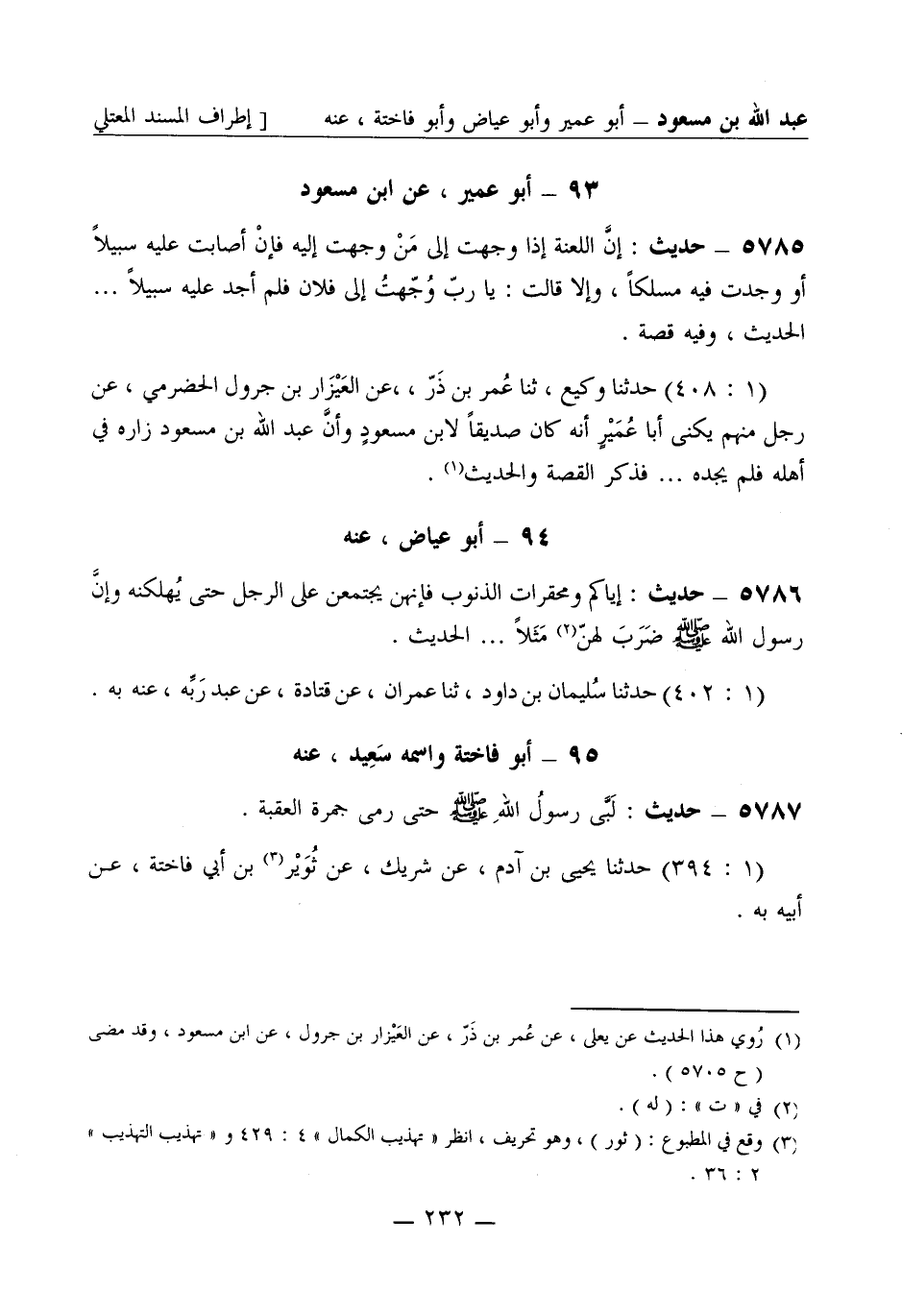 5785 - حديث إن اللعنة إذا وجهت إلى من وجهت إليه فإن أصابت عليه سبيلا أو وجدت فيه مسلكا وإلا قالت يا رب وجهت إلى فلان فلم أجد عليه سبيلا ... الحديث. وفيه قصة (1: 408) حدثنا وكيع، ثنا عمر بن ذر، عن العيزار بن جرول الحضرمي، عن رجل منهم يكنى أبا عمير أنه كان صديقا لابن مسعود وأن عبد الله بن مسعود زاره في أهله فلم يجده ... فذكر القصة والحديث