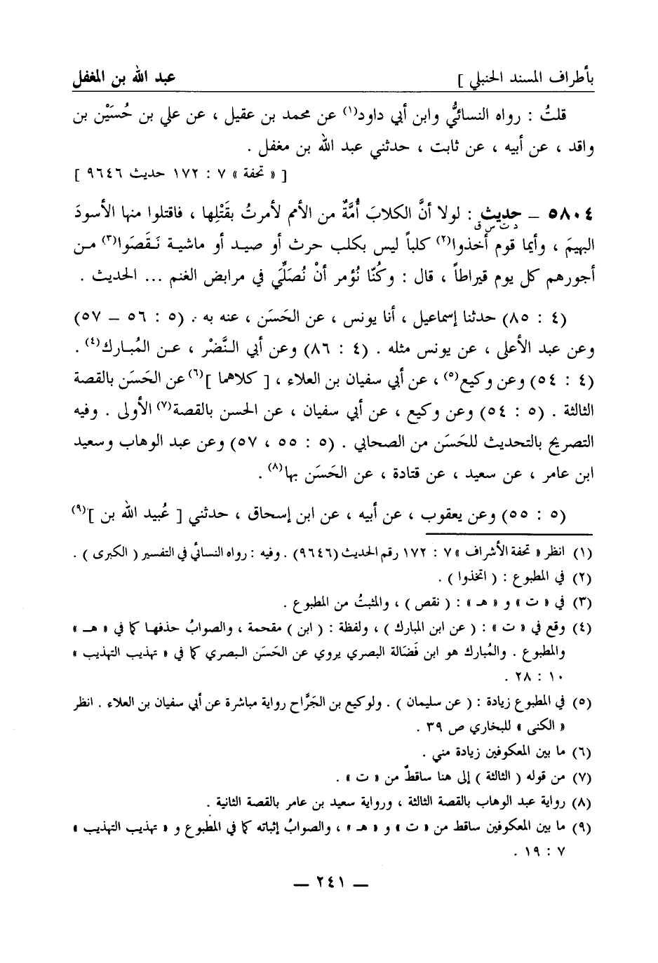 5804 -[د ت س ق] حديث لولا أن الكلاب أمة من الأمم لأمرت بقتلها فاقتلوا منها الأسود البهيم وأيما قوم أخذوا كلبا ليس بكلب حرث أو صيد أو ماشية نقصوا من أجورهم كل يوم قيراطا قال وكنا نؤمر أن نصلي في مرابض الغنم ... الحديث. (4: 85) حدثنا إسماعيل أنا يونس، عن الحسن عنه به. (5: 56 - 57) وعن عبد الأعلى، عن يونس مثله (4: 86) وعن أبي النضر، عن المبارك (4: 54) وعن وكيع، عن أبي سفيان بن العلاء [كلاهما] ، عن الحسن بالقصة الثالثة (5: 54) وعن وكيع، عن أبي سفيان، عن الحسن بالقصة الأولى وفيه التصريح بالتحديث للحسن من الصحابي (5: 55، 57) وعن عبد الوهاب وسعيد بن عامر، عن سعيد، عن قتادة، عن الحسن بها (5: 55) وعن يعقوب، عن أبيه، عن ابن إسحاق، حدثني [عبيد الله بن]-[242]- طلحة بن عبيد الله بن كريز الخزاعي، عن الحسن بالقصة الثالثة بمعناها (5: 56) وعن عبد الصمد، عن الحكم بن عطية، عن الحسن بالقصة الثانية (4: 54، 56) وعن محمد بن جعفر، عن عوف، عن الحسن بها وبالأولى فرقهما