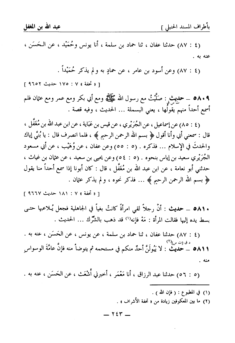 5809 -[ت س ق] حديث صليت مع رسول الله صَلَّى اللَّهُ عَلَيْهِ وَسَلَّمَ ومع أبي بكر ومع عمر ومع عثمان فلم أسمع أحدا منهم يقولها يعني البسملة ... الحديث. وفيه قصة (4: 85) عن إسماعيل، عن الجريري، عن قيس بن عباية، عن ابن عبد الله بن مغفل قال سمعني أبي وأنا أقول بسم الله الرحمن الرحيم فلما انصرف قال يا بني إياك والحدث في الإسلام ... . فذكره (5: 55) وعن عفان، عن وهيب، عن أبي مسعود الجريري سعيد بن إياس بنحوه (5: 54) وعن يحيى بن سعيد، عن عثمان بن غياث، حدثني أبو نعامة، عن ابن عبد الله بن مغفل قال كان أبونا إذا سمع أحدا منا يقول بسم الله الرحمن الرحيم ... . فذكر نحوه. ولم يذكر عثمان