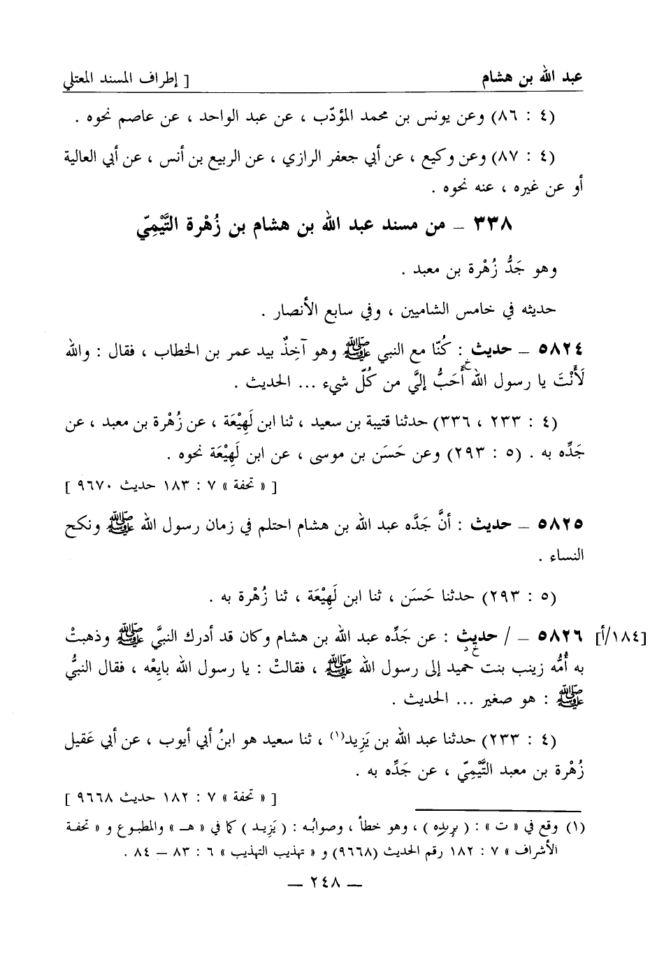 5824 -[خ] حديث كنا مع النبي صَلَّى اللَّهُ عَلَيْهِ وَسَلَّمَ وهو آخذ بيد عمر بن الخطاب فقال والله لأنت يا رسول الله أحب إلي من كل شيء ... الحديث. (4: 233، 336) حدثنا قتيبة بن سعيد، ثنا ابن لهيعة، عن زهرة بن معبد، عن جده به (5: 293) وعن حسن بن موسى، عن ابن لهيعة نحوه.