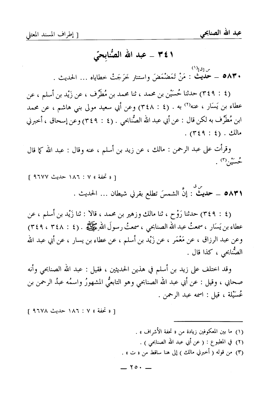 5831 -[س ق] حديث إن الشمس تطلع بقرني شيطان. . الحديث. (4: 349) حدثنا روح، ثنا مالك وزهير بن محمد قالا: ثنا زيد بن أسلم، عن عطاء بن يسار سمعت عبد الله الصنابحي سمعت رسول الله صَلَّى اللَّهُ عَلَيْهِ وَسَلَّمَ (4: 348، 349) وعن عبد الرزاق، عن معمر، عن زيد بن أسلم، عن عطاء بن يسار، عن أبي عبد الله الصنابحي كذا قال. وقد اختلف على زيد بن أسلم في هذين الحديثين فقيل عبد الله الصنابحي وأنه صحابي وقيل: عن أبي عبد الله الصنابحي وهو التابعي المشهور واسمه عبد الرحمن بن عسيلة قيل اسمه عبد الرحمن