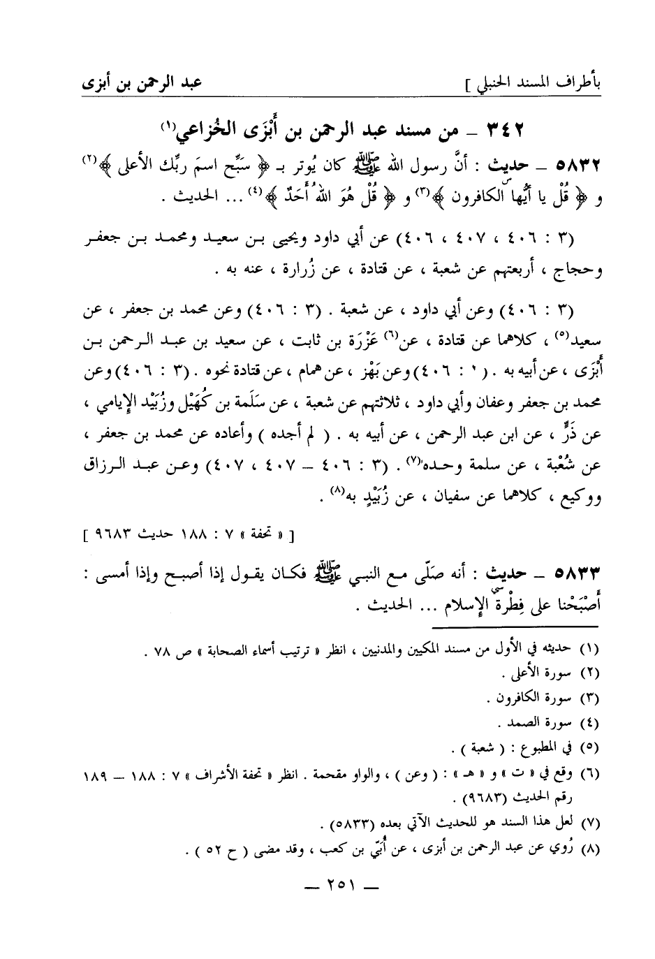 5832 -[س] حديث أن رسول الله صَلَّى اللَّهُ عَلَيْهِ وَسَلَّمَ كان يوتر ب سبح اسم ربك الأعلى وقل يا أيها الكافرون وقل هو الله أحد ... الحديث. (3: 406، 407، 406) عن أبي داود ويحيى بن سعيد ومحمد بن جعفر وحجاج أربعتهم، عن شعبة، عن قتادة، عن زرارة عنه به. (3: 406) وعن أبي داود، عن شعبة (3: 406) وعن محمد بن جعفر، عن سعيد، كلاهما عن قتادة، عن عزرة بن ثابت، عن سعيد بن عبد الرحمن بن أبزى، عن أبيه به. (3: 406) وعن بهز، عن همام، عن قتادة نحوه. (3: 406) وعن محمد بن جعفر وعفان وأبي داود ثلاثتهم، عن شعبة، عن سلمة بن كهيل وزبيد الإيامي، عن ذر، عن ابن عبد الرحمن، عن أبيه به. (لم أجده) وأعاده، عن محمد بن جعفر، عن شعبة، عن سلمة وحده (3: 406 - 407، 407) وعن عبد الرزاق ووكيع، كلاهما عن سفيان، عن زبيد به