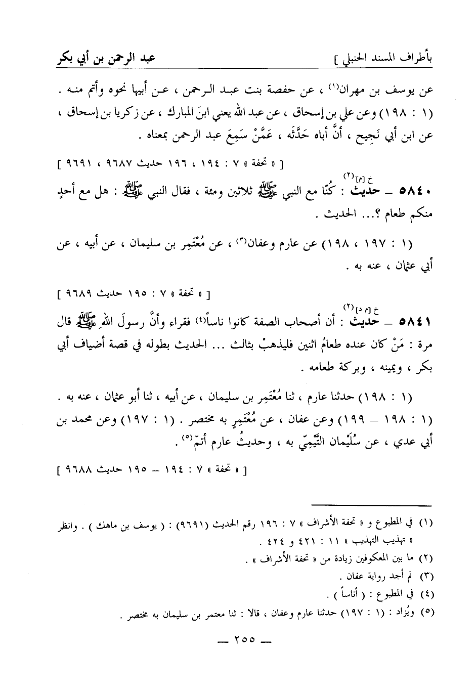 5841 -[خ م د] حديث أن أصحاب الصفة كانوا ناسا فقراء وأن رسول الله صَلَّى اللَّهُ عَلَيْهِ وَسَلَّمَ قال مرة من كان عنده طعام اثنين فليذهب بثالث ... الحديث بطوله. في قصة أضياف أبي بكر ويمينه وبركة طعامه (1: 198) حدثنا عارم، ثنا معتمر بن سليمان، عن أبيه، ثنا أبو عثمان عنه به. (1: 198 - 199) وعن عفان، عن معتمر به مختصر (1: 197) وعن محمد بن أبي عدي، عن سليمان التيمي به وحديث عارم أتم