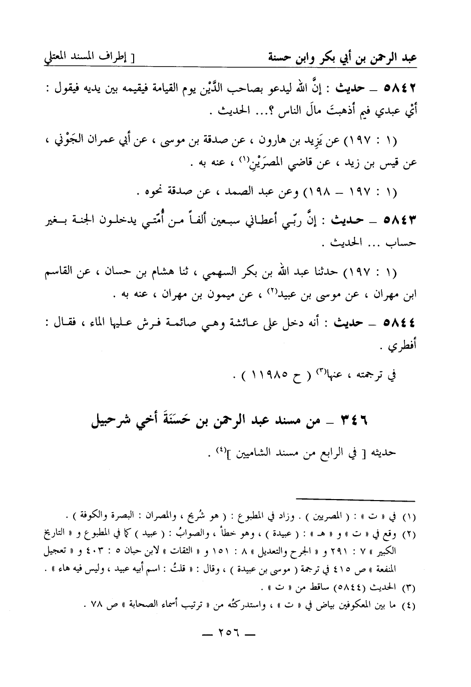 5842 - حديث إن الله ليدعو بصاحب الدين يوم القيامة فيقيمه بين يديه فيقول: أي عبدي فيم أذهبت مال الناس؟ ... . الحديث. (1: 197) عن يزيد بن هارون، عن صدقة بن موسى، عن أبي عمران الجوني، عن قيس بن زيد، عن قاضي المصريين عنه به. (1: 197 - 198) وعن عبد الصمد، عن صدقة نحوه.