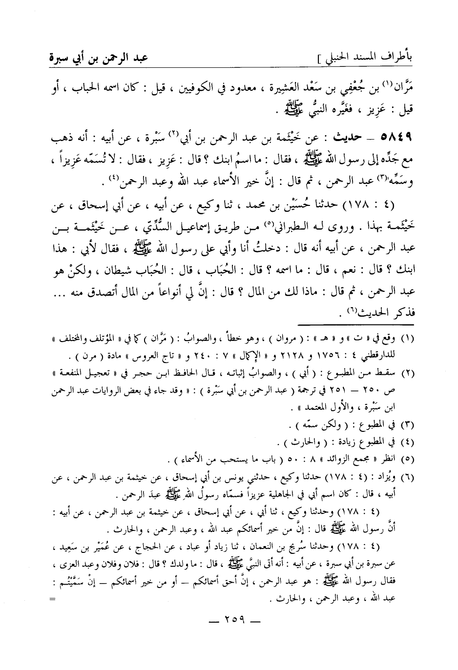 5849 - حديث، عن خيثمة بن عبد الرحمن بن أبي سبرة، عن أبيه أنه ذهب مع جده إلى رسول الله صَلَّى اللَّهُ عَلَيْهِ وَسَلَّمَ فقال ما اسم ابنك؟ قال عزيز فقال لا تسمه عزيزا وسمه عبد الرحمن ثم قال إن خير الأسماء عبد الله وعبد الرحمن (4: 178) حدثنا حسين بن محمد، ثنا وكيع، عن أبيه، عن أبي إسحاق، عن خيثمة بهذا وروى له الطبراني من طريق إسماعيل السدي، عن خيثمة بن عبد الرحمن، عن أبيه أنه قال دخلت أنا وأبي على رسول الله صَلَّى اللَّهُ عَلَيْهِ وَسَلَّمَ فقال لأبي هذا ابنك؟ قال نعم قال ما اسمه؟ قال الحباب قال الحباب شيطان ولكن هو عبد الرحمن ثم قال ماذا لك من المال؟ قال إن لي أنواعا من المال أتصدق منه ... فذكر الحديث