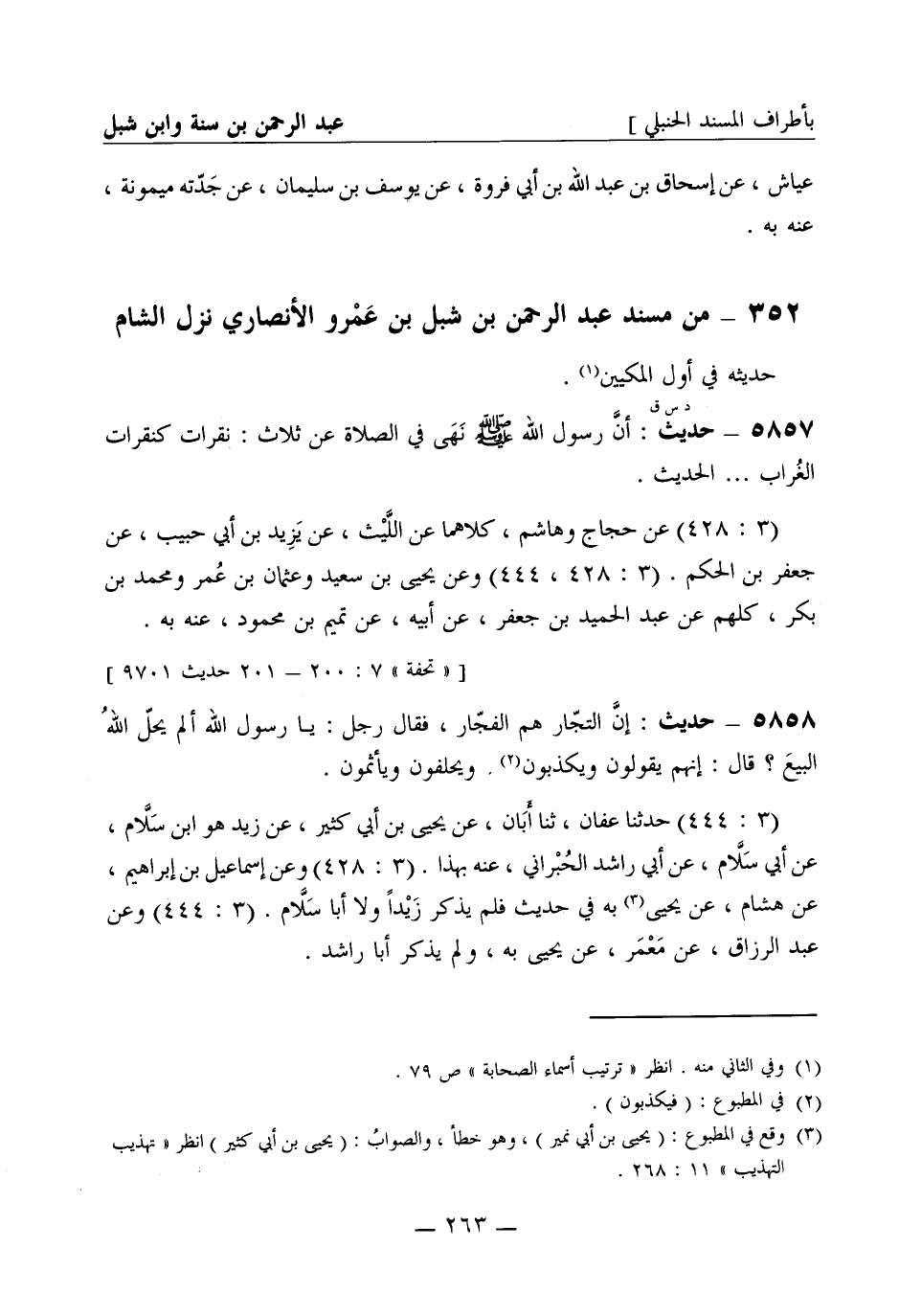 5858 - حديث إن التجار هم الفجار فقال رجل يا رسول الله ألم يحل الله البيع؟ قال إنهم يقولون ويكذبون ويحلفون ويأثمون (3: 444) حدثنا عفان، ثنا أبان، عن يحيى بن أبي كثير، عن زيد هو ابن سلام، عن أبي سلام، عن أبي راشد الحبراني، عنه بهذا. (3: 428) وعن إسماعيل بن إبراهيم، عن هشام، عن يحيى به في حديث فلم يذكر زيدا ولا أبا سلام (3: 444) وعن عبد الرزاق، عن معمر، عن يحيى به ولم يذكر أبا راشد