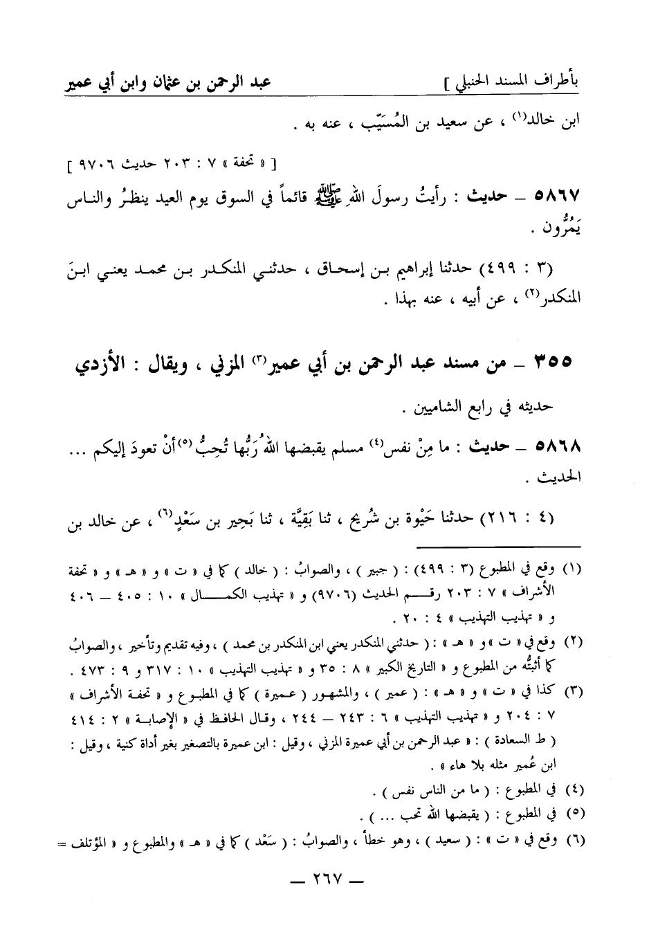5868 - حديث ما من نفس مسلم يقبضها الله ربها تحب أن تعود إليكم ... الحديث. (4: 216) حدثنا حيوة بن شريح، ثنا بقية، ثنا بحير بن سعد، عن خالد بن -[268]- معدان، عن جبير بن نفير، عن ابن أبي عمير به