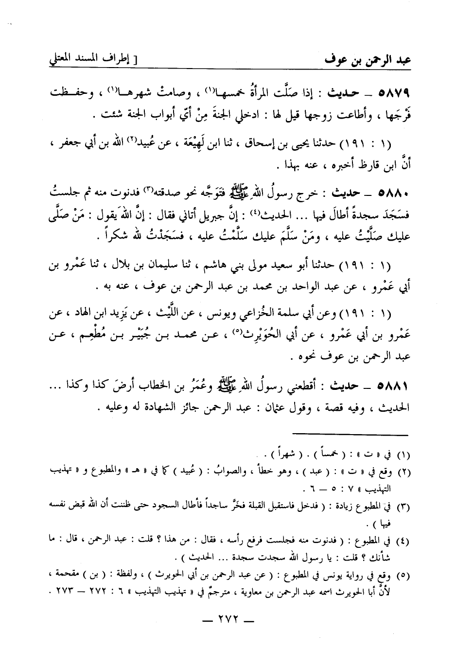 5880 - حديث خرج رسول الله صَلَّى اللَّهُ عَلَيْهِ وَسَلَّمَ فتوجه نحو صدقته فدنوت منه ثم جلست فسجد سجدة أطال فيها ... الحديث. إن جبريل أتاني فقال إن الله يقول من صلى عليك صليت عليه ومن سلم عليك سلمت عليه، فسجدت لله شكرا (1: 191) حدثنا أبو سعيد مولى بني هاشم، ثنا سليمان بن بلال، ثنا عمرو بن أبي عمرو، عن عبد الواحد بن محمد بن عبد الرحمن بن عوف عنه به. (1: 191) وعن أبي سلمة الخزاعي ويونس، عن الليث، عن يزيد بن الهاد، عن عمرو بن أبي عمرو، عن أبي الحويرث، عن محمد بن جبير بن مطعم، عن عبد الرحمن بن عوف نحوه.