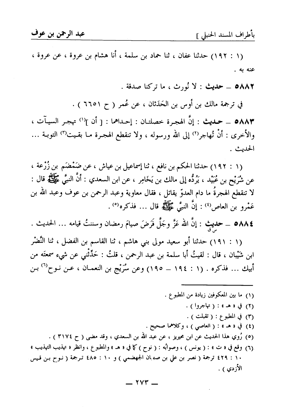 5883 - حديث إن الهجرة خصلتان إحداهما [أن] تهجر السيئات والأخرى أن تهاجر إلى الله ورسوله ولا تنقطع الهجرة ما بقيت التوبة ... الحديث (1: 192) حدثنا الحكم بن نافع، ثنا إسماعيل بن عياش، عن ضمضم بن زرعة، عن شريح بن عبيد يرده إلى مالك بن يخامر، عن ابن السعدي أن النبي صَلَّى اللَّهُ عَلَيْهِ وَسَلَّمَ قال لا تنقطع الهجرة ما دام العدو يقاتل فقال معاوية وعبد الرحمن بن عوف وعبد الله بن عمرو بن العاص إن النبي صَلَّى اللَّهُ عَلَيْهِ وَسَلَّمَ قال ... فذكره
