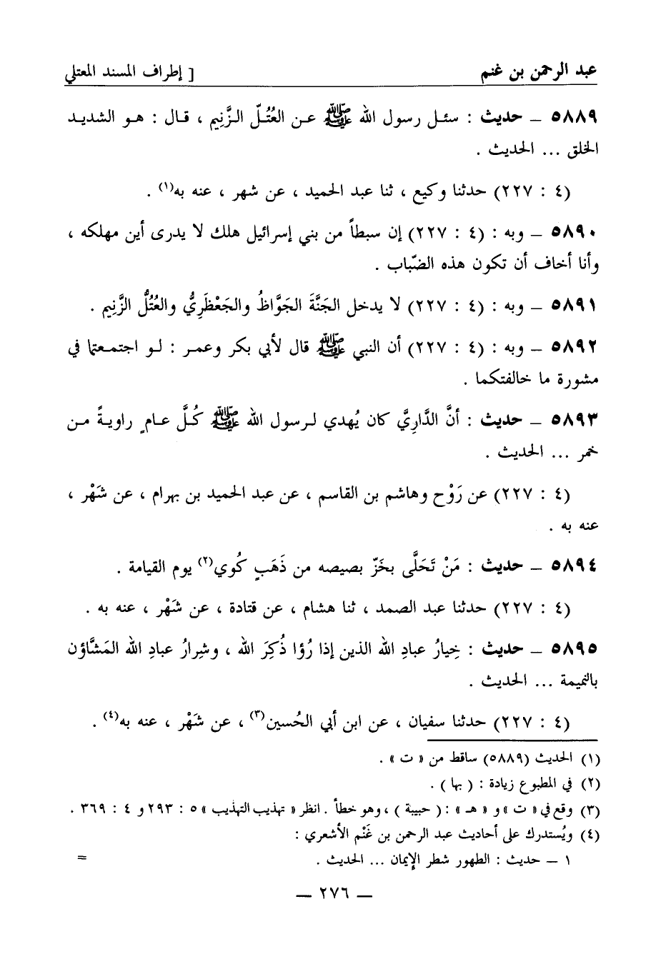 5895 - حديث خيار عباد الله الذين إذا رؤا ذكر الله وشرار عباد الله المشاؤن بالنميمة ... الحديث. (4: 227) حدثنا سفيان، عن ابن أبي الحسين، عن شهر عنه به.