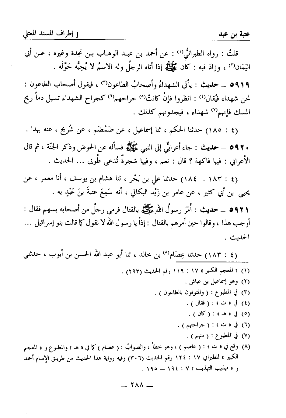 5920 - حديث جاء أعرابي إلى النبي صَلَّى اللَّهُ عَلَيْهِ وَسَلَّمَ فسأله عن الحوض وذكر الجنة ثم قال الأعرابي فيها فاكهة؟ قال نعم وفيها شجرة تدعى طوبى. . الحديث. (4: 183 - 184) حدثنا علي بن بحر، ثنا هشام بن يوسف أنا معمر، عن يحيى بن أبي كثير، عن عامر بن زيد البكالي أنه سمع عتبة بن عبد به