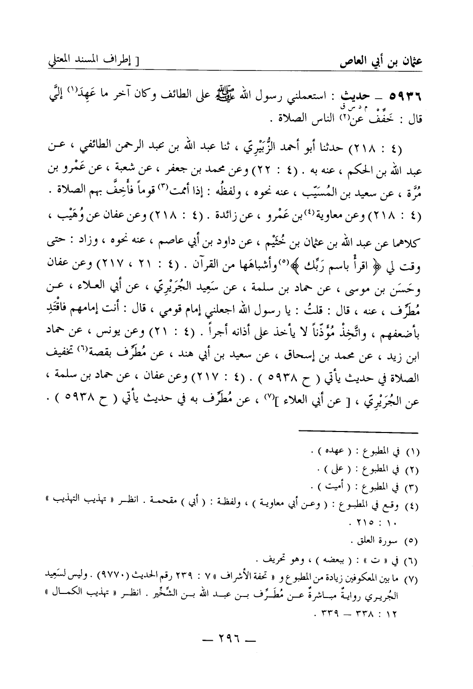 5936 -[م د س ق] حديث استعملني رسول الله صَلَّى اللَّهُ عَلَيْهِ وَسَلَّمَ على الطائف وكان آخر ما عهد إلي قال خفف عن الناس الصلاة (4: 218) حدثنا أبو أحمد الزبيري، ثنا عبد الله بن عبد الرحمن الطائفي، عن عبد الله بن الحكم عنه به. (4: 22) وعن محمد بن جعفر، عن شعبة، عن عمرو بن مرة، عن سعيد بن المسيب عنه نحوه. ولفظه إذا أممت قوما فأخف بهم الصلاة (4: 218) وعن معاوية بن عمرو، عن زائدة (4: 218) وعن عفان، عن وهيب، كلاهما عن عبد الله بن عثمان بن خثيم، عن داود بن أبي عاصم عنه نحوه. وزاد حتى وقت لي اقرأ باسم ربك وأشباهها من القرآن (4: 21، 217) وعن عفان وحسن بن موسى، عن حماد بن سلمة، عن سعيد الجريري، عن أبي العلاء، عن مطرف عنه قال قلت يا رسول الله اجعلني إمام قومي قال أنت إمامهم فاقتد بأضعفهم واتخذ مؤذنا لا يأخذ على أذانه أجرا (4: 21) وعن يونس، عن حماد بن زيد، عن محمد بن إسحاق، عن سعيد بن أبي هند، عن مطرف بقصة تخفيف الصلاة في حديث يأتي (ح 5938) (4: 217) وعن عفان، عن حماد بن سلمة، عن الجريري، [عن أبي العلاء] ، عن مطرف به في حديث يأتي (ح -[297]- 5938) (4: 216، 21 - 22) وعن يحيى بن سعيد ووكيع، عن عمرو بن عثمان، عن موسى بن طلحة عنه بقصة تخفيف الصلاة (4: 21) وعن محمد بن جعفر، عن شعبة، عن النعمان بن سالم سمعت أشياخا من ثقيف قالوا، حدثنا عثمان بها