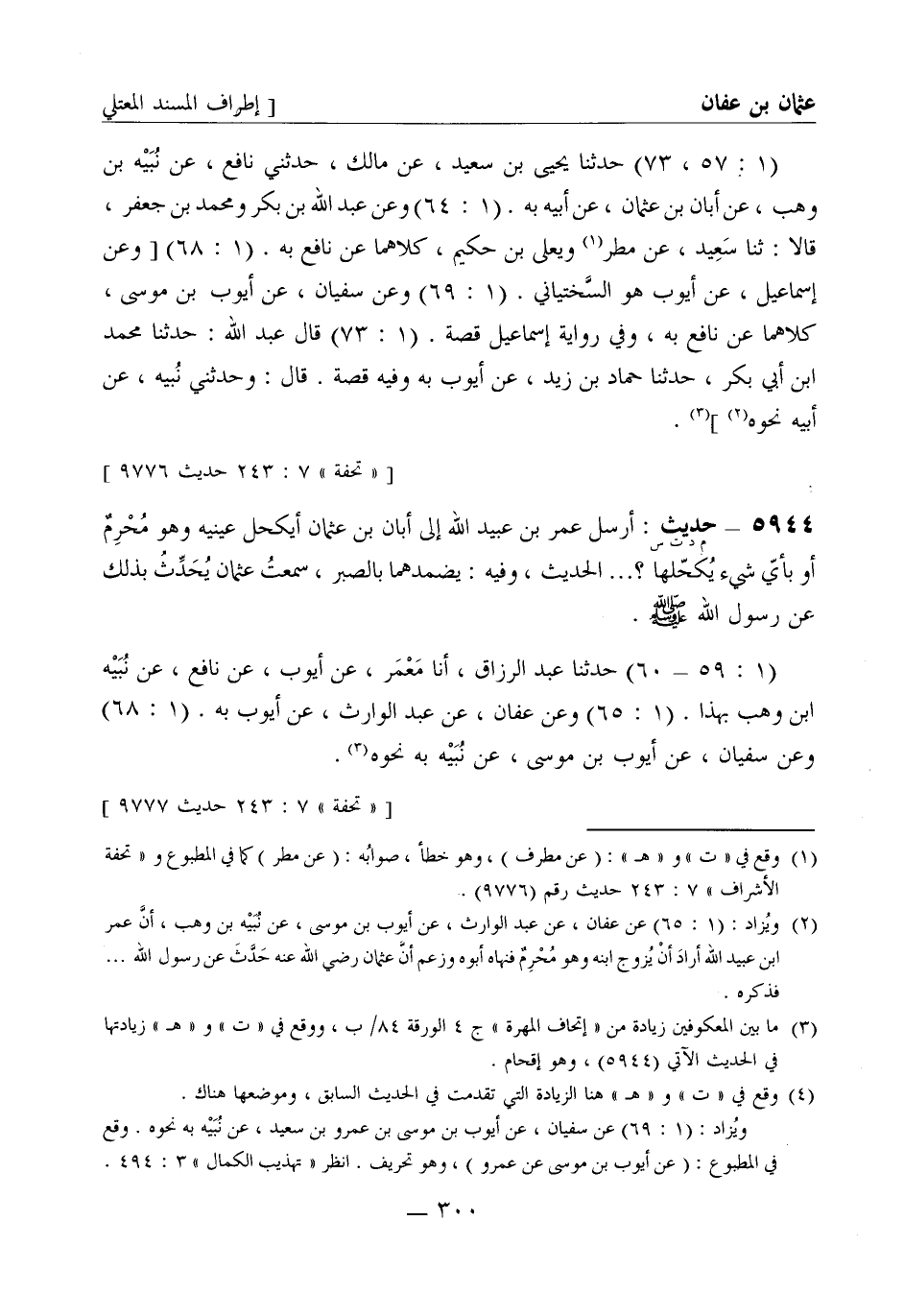 5944 -[م د ت س] حديث أرسل عمر بن عبيد الله إلى أبان بن عثمان أيكحل عينيه وهو محرم أو بأي شيء يكحلها؟ ... . الحديث. وفيه يضمدهما بالصبر سمعت عثمان يحدث بذلك عن رسول الله صَلَّى اللَّهُ عَلَيْهِ وَسَلَّمَ (1: 59 - 60) حدثنا عبد الرزاق أنا معمر، عن أيوب، عن نافع، عن نبيه بن وهب بهذا (1: 65) وعن عفان، عن عبد الوارث، عن أيوب به (1: 68) وعن سفيان، عن أيوب بن موسى، عن نبيه به نحوه.