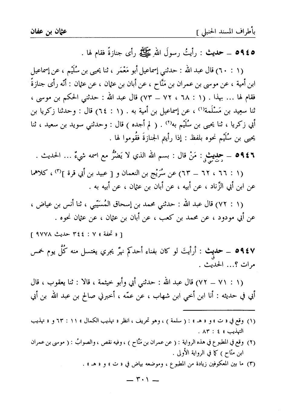 5945 - حديث رأيت رسول الله صَلَّى اللَّهُ عَلَيْهِ وَسَلَّمَ رأى جنازة فقام لها (1: 60) قال عبد الله: حدثني إسماعيل أبو معمر، ثنا يحيى بن سليم، عن إسماعيل بن أمية، عن موسى بن عمران بن مناح، عن أبان بن عثمان، عن عثمان أنه رأى جنازة فقام لها ... بهذا (1: 68، 72 - 73) قال عبد الله: حدثني الحكم بن موسى، ثنا سعيد بن مسلمة، عن إسماعيل بن أمية به (1: 64) قال وحدثنا زكريا بن أبي زكريا، ثنا يحيى بن سليم به، (لم أجده) قال: وحدثني سويد بن سعيد، ثنا يحيى بن سليم نحوه. بلفظ إذا رأيتم الجنازة فقوموا لها