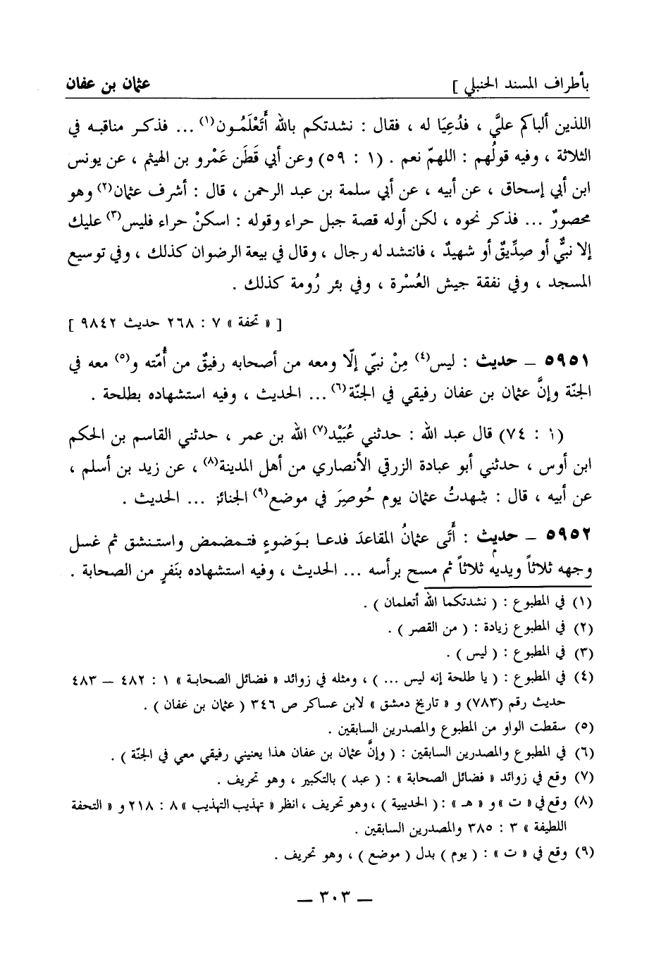 5951 - حديث ليس من نبي إلا ومعه من أصحابه رفيق من أمته ومعه في الجنة وإن عثمان بن عفان رفيقي في الجنة ... الحديث. وفيه استشهاده بطلحة (1: 74) قال عبد الله: حدثني عبيد الله بن عمر، حدثني القاسم بن الحكم بن أوس، حدثني أبو عبادة الزرقي الأنصاري من أهل المدينة، عن زيد بن أسلم، عن أبيه قال شهدت عثمان يوم حوصر في موضع الجنائز ... الحديث.
