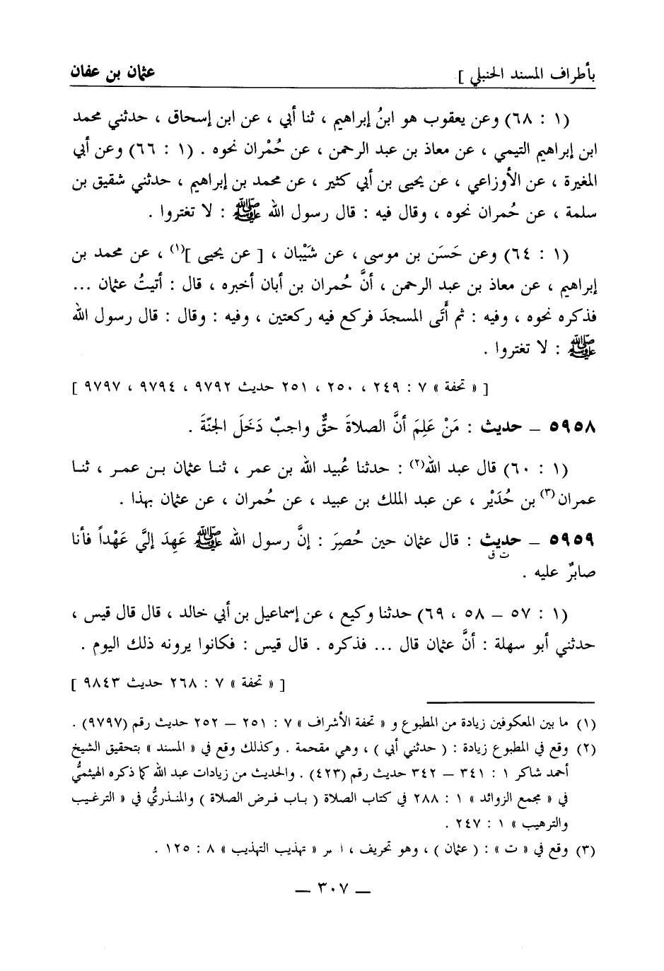 5958 - حديث من علم أن الصلاة حق واجب دخل الجنة (1: 60) قال عبد الله: حدثنا عبيد الله بن عمر، ثنا عثمان بن عمر، ثنا عمران بن حدير، عن عبد الملك بن عبيد، عن حمران، عن عثمان بهذا
