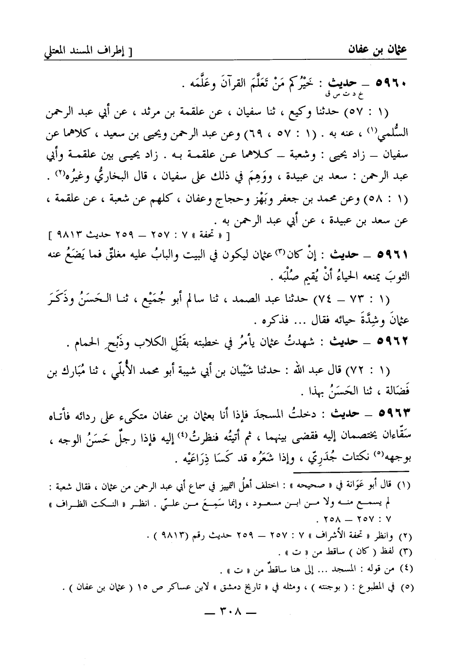 5960 -[خ د ت س ق] حديث خيركم من تعلم القرآن وعلمه (1: 57) حدثنا وكيع، ثنا سفيان، عن علقمة بن مرثد، عن أبي عبد الرحمن السلمي عنه به. (1: 57، 69) وعن عبد الرحمن ويحيى بن سعيد، كلاهما عن سفيان زاد يحيى وشعبة، كلاهما عن علقمة به زاد يحيى بين علقمة وأبي عبد الرحمن: سعد بن عبيدة ووهم في ذلك على سفيان قال البخاري وغيره (1: 58) وعن محمد بن جعفر وبهز وحجاج وعفان كلهم، عن شعبة، عن علقمة، عن سعد بن عبيدة، عن أبي عبد الرحمن به