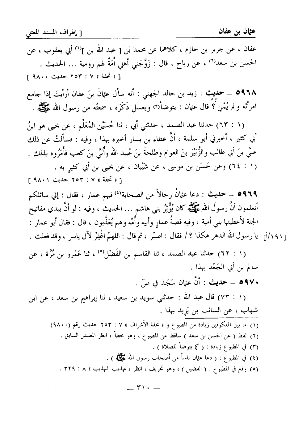 5968 -[خ م] حديث زيد بن خالد الجهني أنه سأل عثمان بن عفان أرأيت إذا جامع امرأته ولم يمن؟ قال عثمان يتوضأ ويغسل ذكره سمعته من رسول الله صَلَّى اللَّهُ عَلَيْهِ وَسَلَّمَ (1: 63) حدثنا عبد الصمد، حدثني أبي، ثنا حسين المعلم، عن يحيى هو ابن أبي كثير، أخبرني أبو سلمة أن عطاء بن يسار أخبره بهذا وفيه فسألت عن ذلك علي بن أبي طالب والزبير بن العوام وطلحة بن عبيد الله وأبي بن كعب فأمروه بذلك (1: 64) وعن حسن بن موسى، عن شيبان، عن يحيى بن أبي كثير به