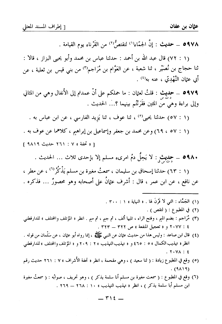 5980 -[د ت س ق] حديث لا يحل دم امرئ مسلم إلا بإحدى ثلاث ... الحديث. (1: 63) حدثنا إسحاق بن سليمان سمعت مغيرة بن مسلم يذكر، عن مطر، عن نافع، عن ابن عمر قال أشرف عثمان على أصحابه وهو محصور ... فذكره -[315]- (1: 61 - 62، 65، 70) وعن عفان وسليمان بن حرب مجموعا ومفرقا، كلاهما عن حماد بن زيد، عن يحيى بن سعيد، عن أبي أمامة قال كنت مع عثمان في الدار وهو محصور ... الحديث. وفيه معناه (1: 62) قال عبد الله: حدثني القواريري، ثنا حماد بن زيد به