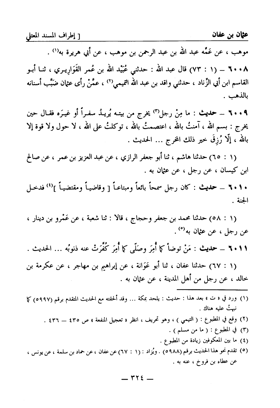 6011 - حديث من توضأ كما أمر وصلى كما أمر كفرت عنه ذنوبه ... الحديث. (1: 67) حدثنا عفان، ثنا أبو عوانة، عن إبراهيم بن مهاجر، عن عكرمة بن خالد، عن رجل من أهل المدينة، عن عثمان به