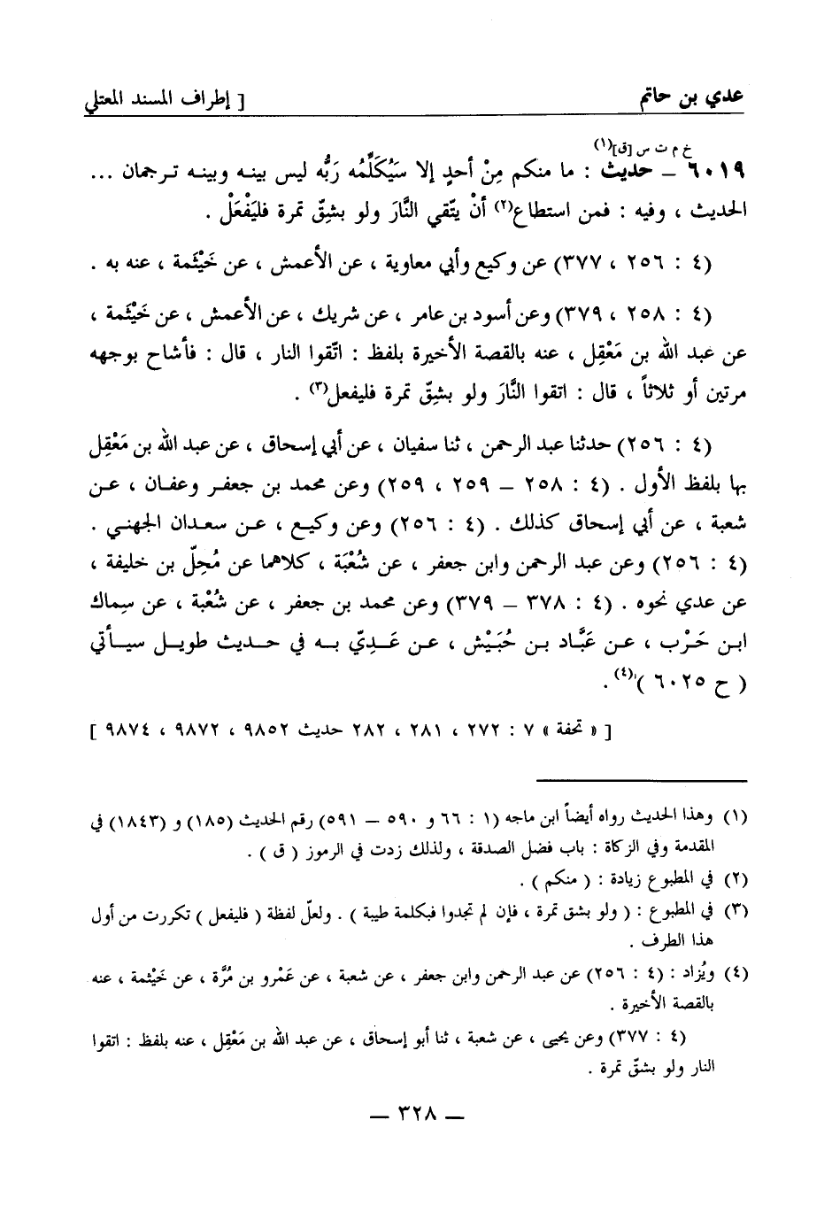6019 -[خ م ت س ق] حديث ما منكم من أحد إلا سيكلمه ربه ليس بينه وبينه ترجمان ... الحديث. وفيه فمن استطاع أن يتقي النار ولو بشق تمرة فليفعل (4: 256، 377) عن وكيع وأبي معاوية، عن الأعمش، عن خيثمة عنه به. (4: 258، 379) وعن أسود بن عامر، عن شريك، عن الأعمش، عن خيثمة، عن عبد الله بن معقل عنه بالقصة الأخيرة بلفظ اتقوا النار قال فأشاح بوجهه مرتين أو ثلاثا قال اتقوا النار ولو بشق تمرة فليفعل (4: 256) حدثنا عبد الرحمن، ثنا سفيان، عن أبي إسحاق، عن عبد الله بن معقل بها بلفظ الأول (4: 258 - 259، 259) وعن محمد بن جعفر وعفان، عن شعبة، عن أبي إسحاق كذلك (4: 256) وعن وكيع، عن سعدان الجهني (4: 256) وعن عبد الرحمن وابن جعفر، عن شعبة، كلاهما عن محل بن خليفة، عن عدي نحوه. (4: 378 - 379) وعن محمد بن جعفر، عن شعبة، عن سماك بن حرب، عن عباد بن حبيش، عن عدي به في حديث طويل سيأتي (ح 6025)
